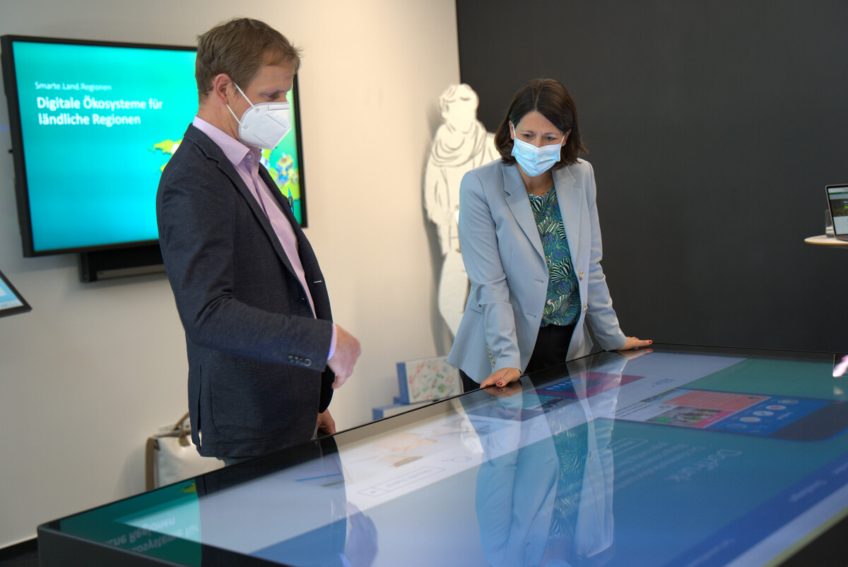 Steffen Hess erklärte der Ministerin das Forschungsprojekt Smarte.Land.Regionen. Dabei stellte er die sieben Modellregionen mit ihren Themenbereichen vor. Aus dem Themenbereich Bildung und Arbeit wurden die ersten Prototypen zum mobilen Arbeiten verdeutlicht. In diesen Zusammenhang wurde diskutiert, wie mithilfe der Digitalisierung das Co-Working erleichtert und somit trotz hybrider Teams soziale Nähe geschaffen werden kann. Neben den Prototypen im Projekt Smarte.Land.Regionen präsentierte Steffen Hess weitere Lösungen und Prototypen, die im Rahmen verschiedener Projekte zur Verbesserung der Lebensqualität in ländlichen Regionen entstanden sind.
